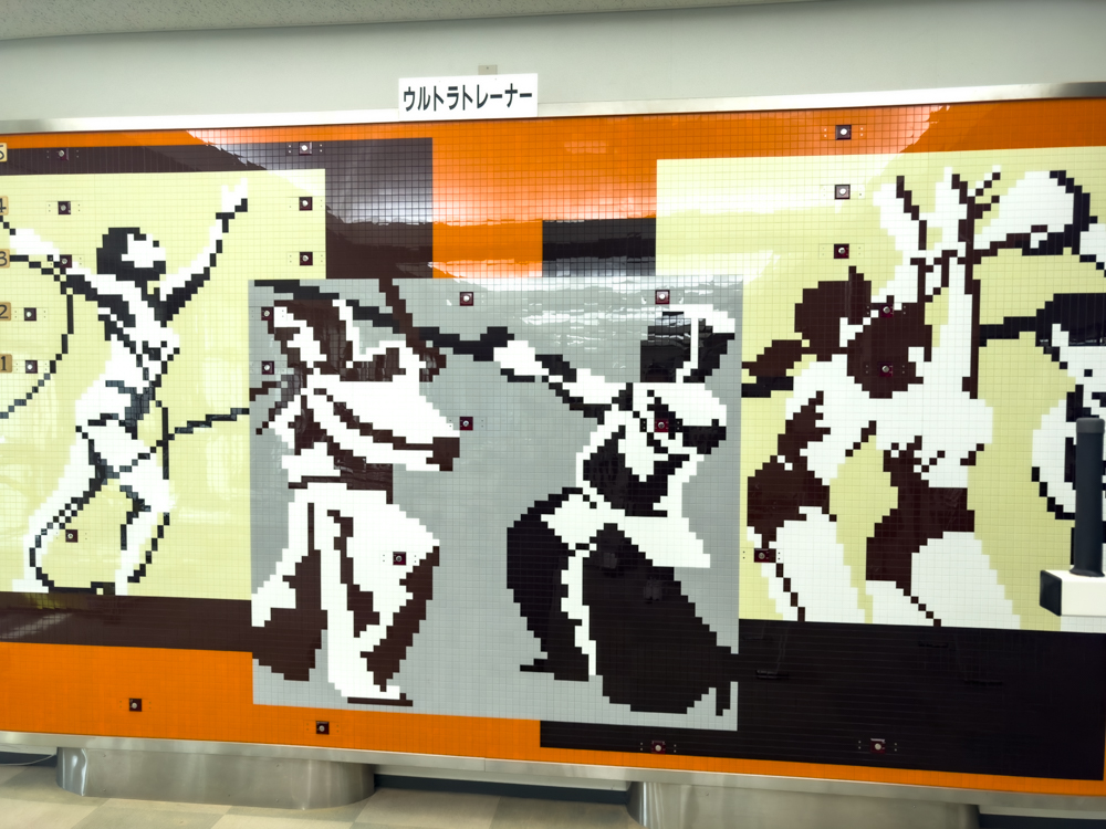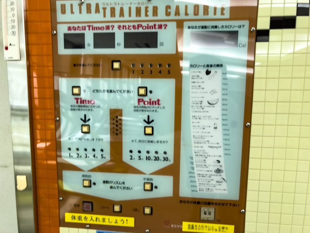 ウルトラトレーナーと呼ばれるこのトレーニングマシン。ランダムに光る部分を指定時間内に押していくというもので、反射神経と持久力が問われます。試してみると、思っている以上に難しかったです。