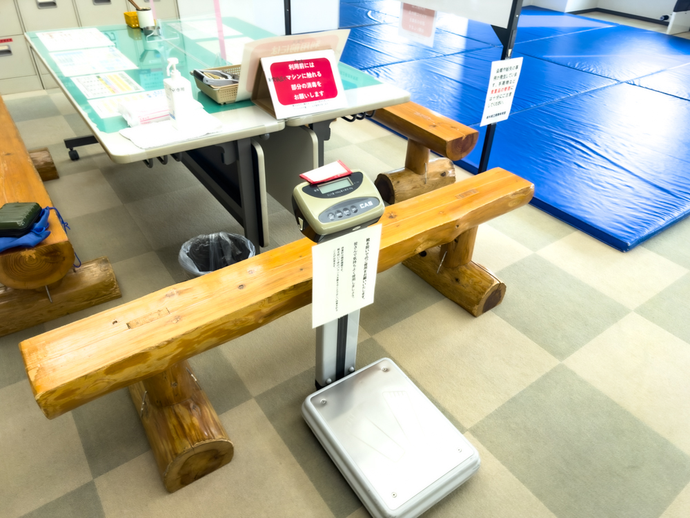 トレーニング室に入りました。入り口からすぐの所に体重計などがあり、日々の体調チェックなどが行えます。