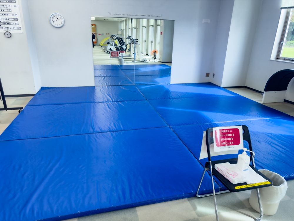 運動前には、しっかりとした準備が必要です。服装チェックのための大きな鏡、ストレッチや準備体操用のスペースもしっかり確保されているのはありがたいですね。