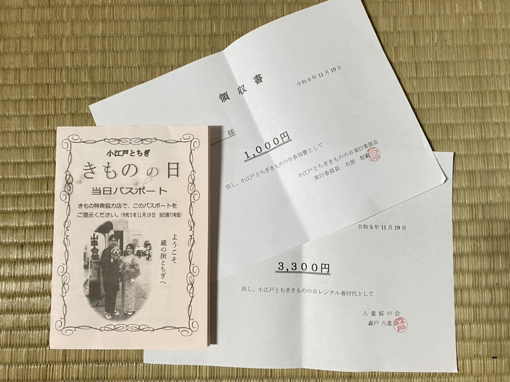 当日パスポート1,000円と着物レンタル・着付け代の3,300円を現金でお支払い。