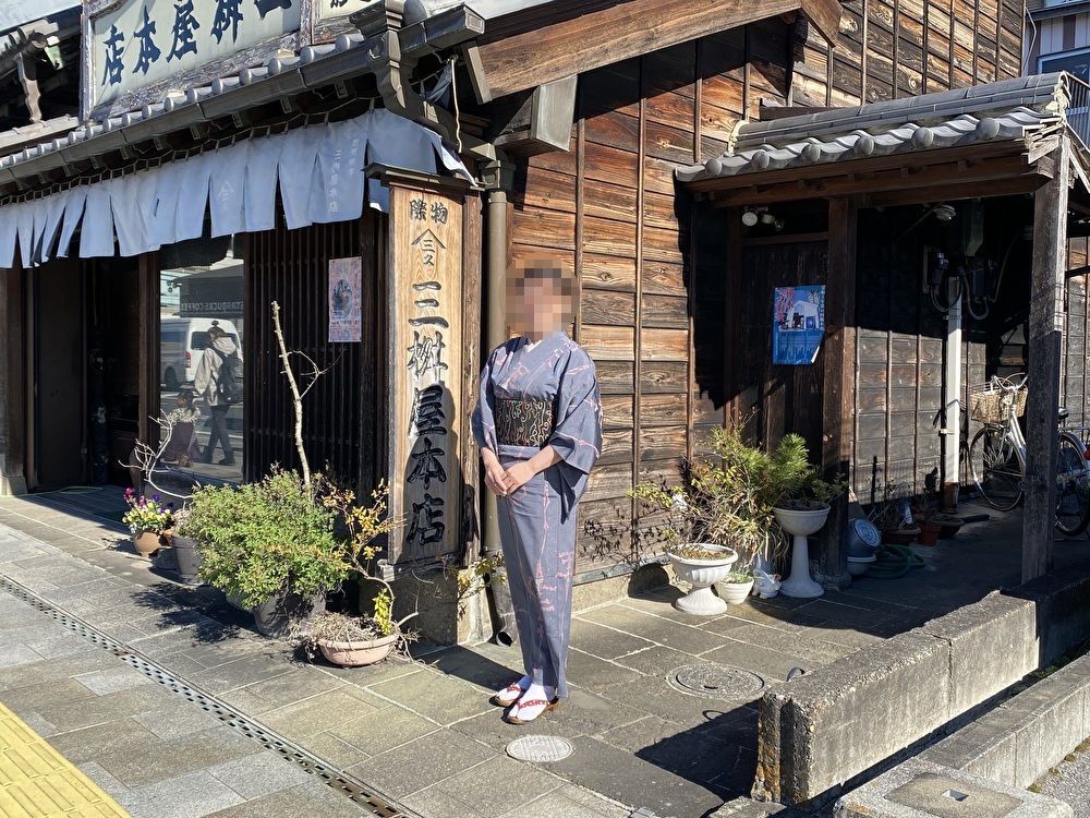 横山資料館の中庭にて、着物姿で撮影しました。ごらんのとおり、着物で撮影しますと、横山郷土館の景観としっくりなじみますね。いい感じです。