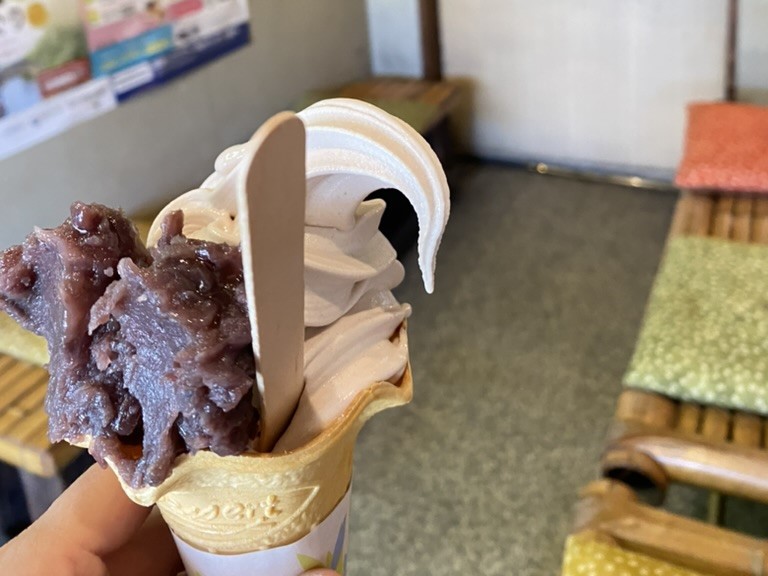 くどすぎない甘さに癒される街の名物です。ソフトクリームにもあんこが入っていて、若干色がついているのが冨士屋さん流。ぜひ食べてみてください。