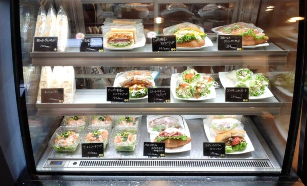 冷蔵ショーケースには種類豊富なサンドイッチがこんなに!新鮮な野菜とこわだりの具材がぎっしり詰まったサンドイッチは、お昼過ぎには完売してしまうほど。