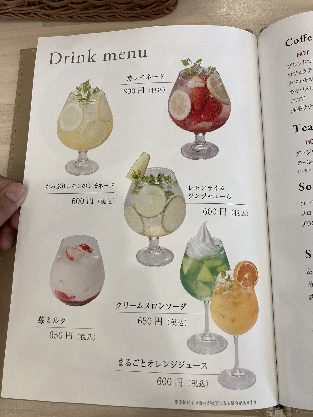 メニューを開くと、食事とデザート、ドリンクがありました。