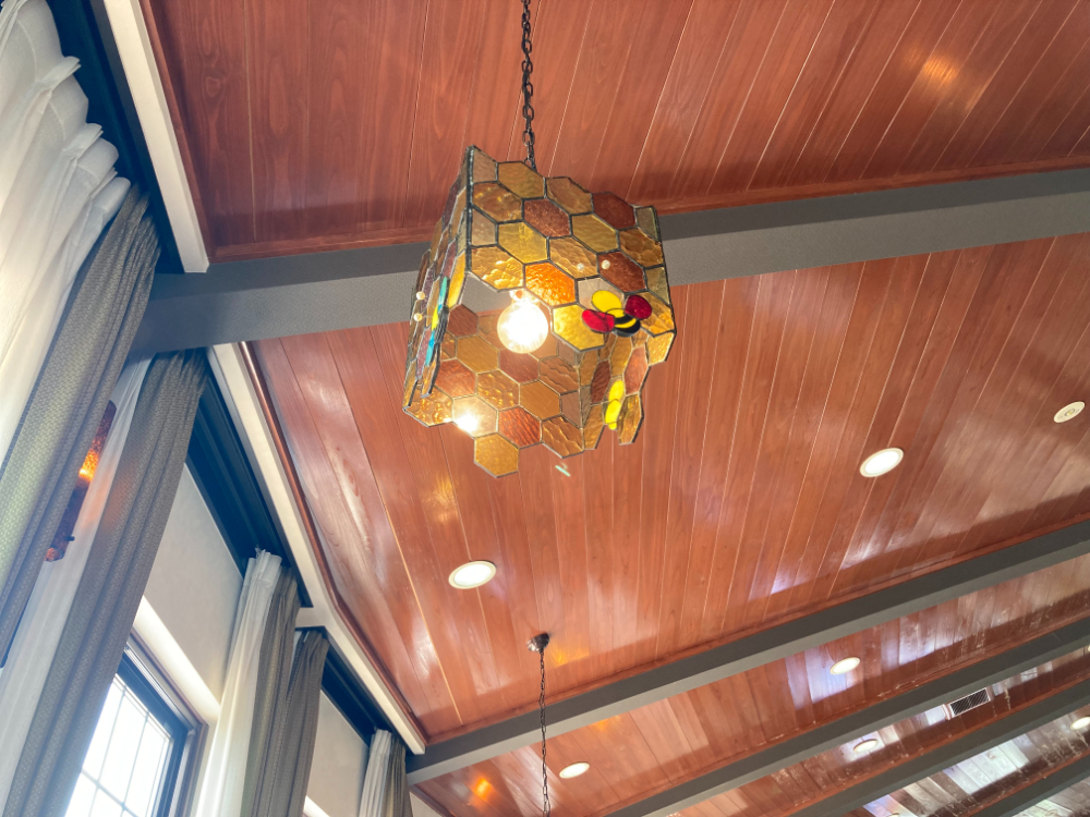 店内の照明はほとんどがはちの巣のステンドグラスになっていて、とてもかわいかったです。