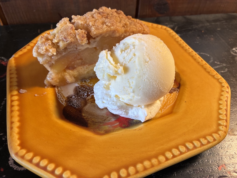 アップルパイの中のりんごはシナモンが少なめで柔らかく、上のクランブルの表面には少し焼きの感じが残っていてザクザクの食感が楽しめます。