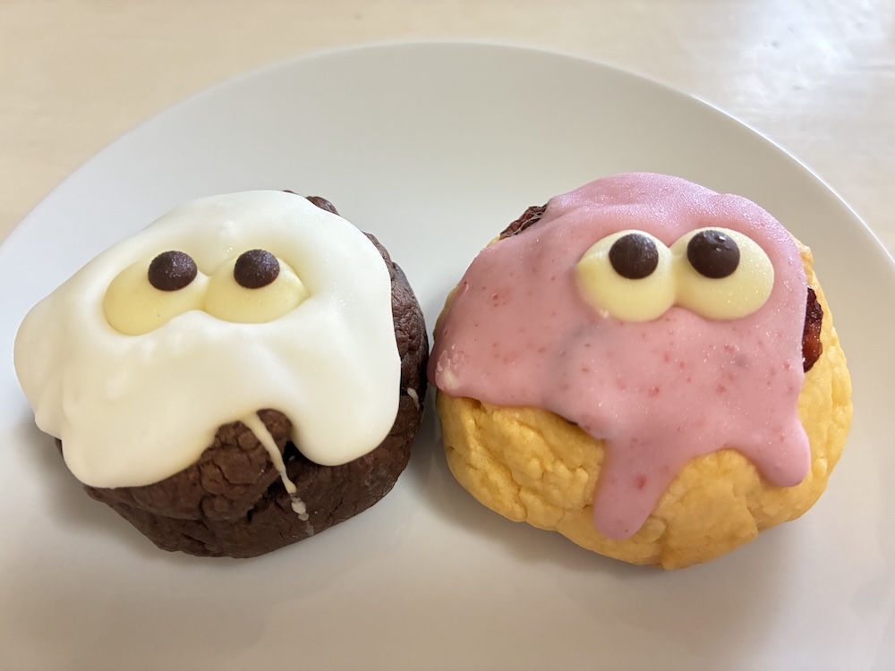 ホワイトチョコ、ストロベリーチョコがかけられた上に目があってかわいいですね。