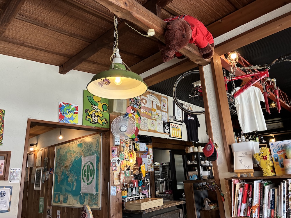 天井のはりにはクマのぬいぐるみ、自転車まではりついています。