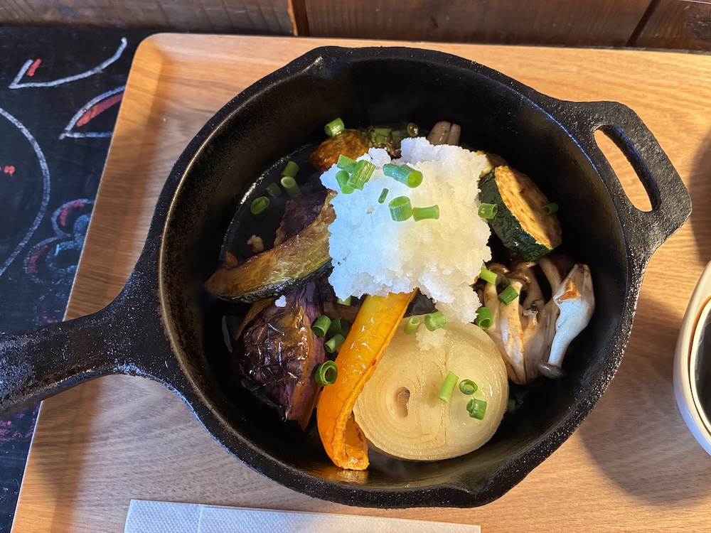 スキレットには、ハンバーグ、かぼちゃ、玉ねぎ、パプリカ、ズッキーニ、しめじ、なすと山盛りのだいこんおろし!