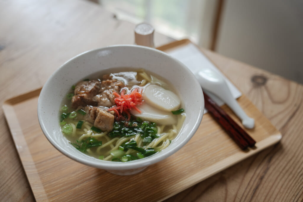 沖縄ソーキソバは980円。スープがあっさりで全部飲み干せるほどです。ソーキはほろほろとほどける柔らかさで脂がくどくないあっさりめ。沖縄こしょうをかけると味に深みが増します。