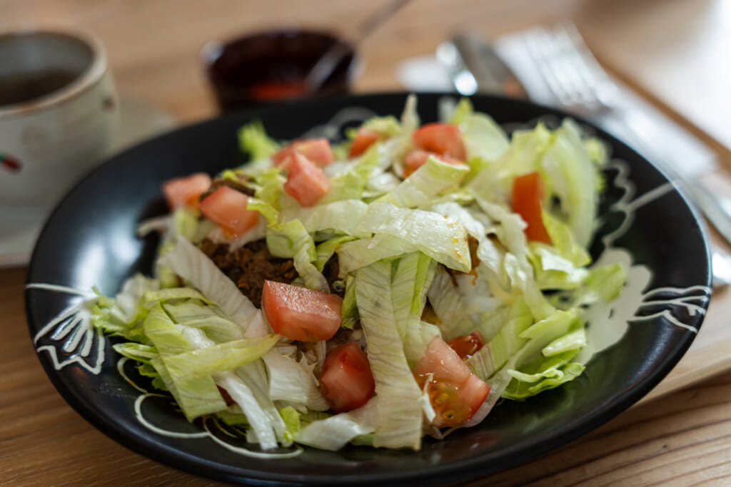 タコライスはもずくスープとドリンク付きで1,390円。追いケチャップも付いています。野菜たっぷりで、お肉感はそこまで強くなくあっさり食べられます。