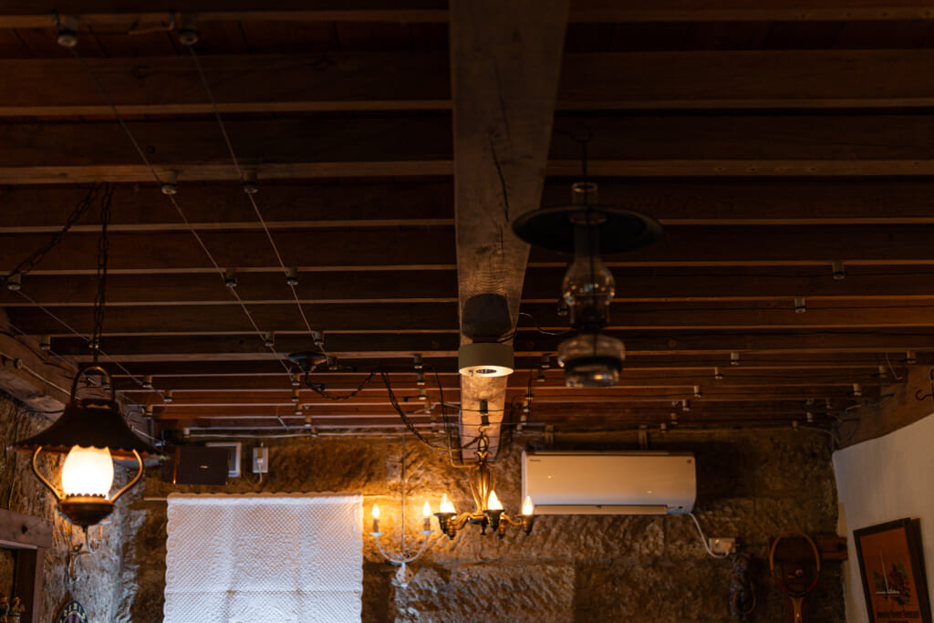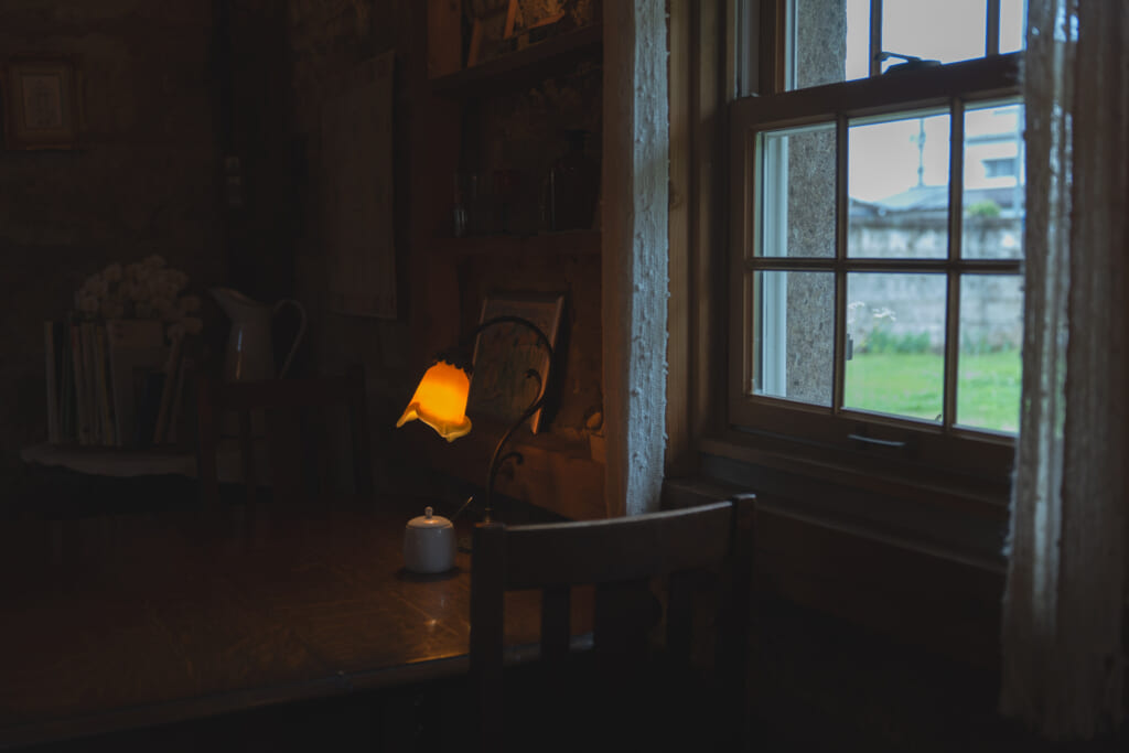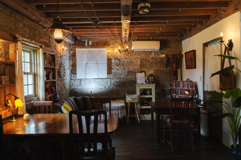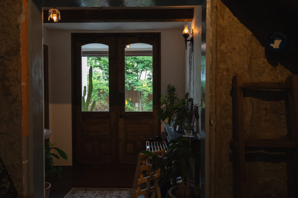 ゆうに100年は超えているという大谷石蔵をリノベーションしたという建物は、アンティークの家具や照明でコーディネートされ、天井の梁は全て当時の物。東日本大震災後に、今の佇まいになったそうです。