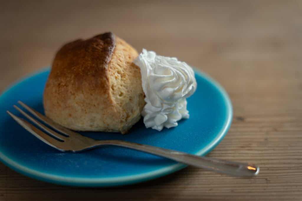 スコーン260円には、生クリームが添えられています。バターの香りがよく優しいお味。けっこう大きいですがサクッと食べられます。ちなみに、珈琲は豆からひいて淹れてくれる本格的なもの。