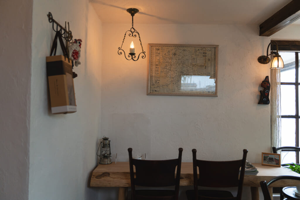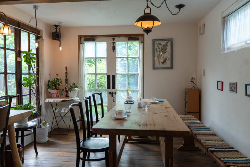 こちらは先ほどの空間とは趣が変わり日当たりの良い明るい空間。6人席のアンティークの一枚板テーブルがとても味わいがあり素敵でした。伺ったのは日曜日の14:00頃。1組先客がおりまして6人席が空いていたので、こちらへ座りました。