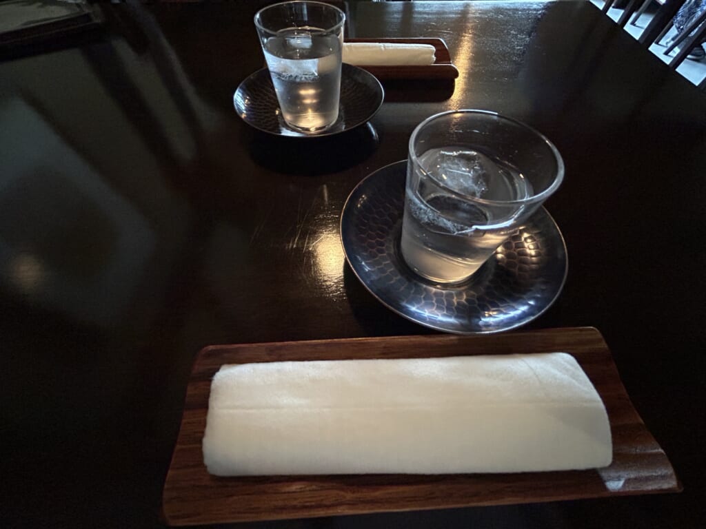 お冷のグラスのサイズ感が小ぶりで可愛いです。茶托は、鉄素材なのでキーンと冷えた感じが保たれますし、光の反射が綺麗で見ているだけで癒されます。