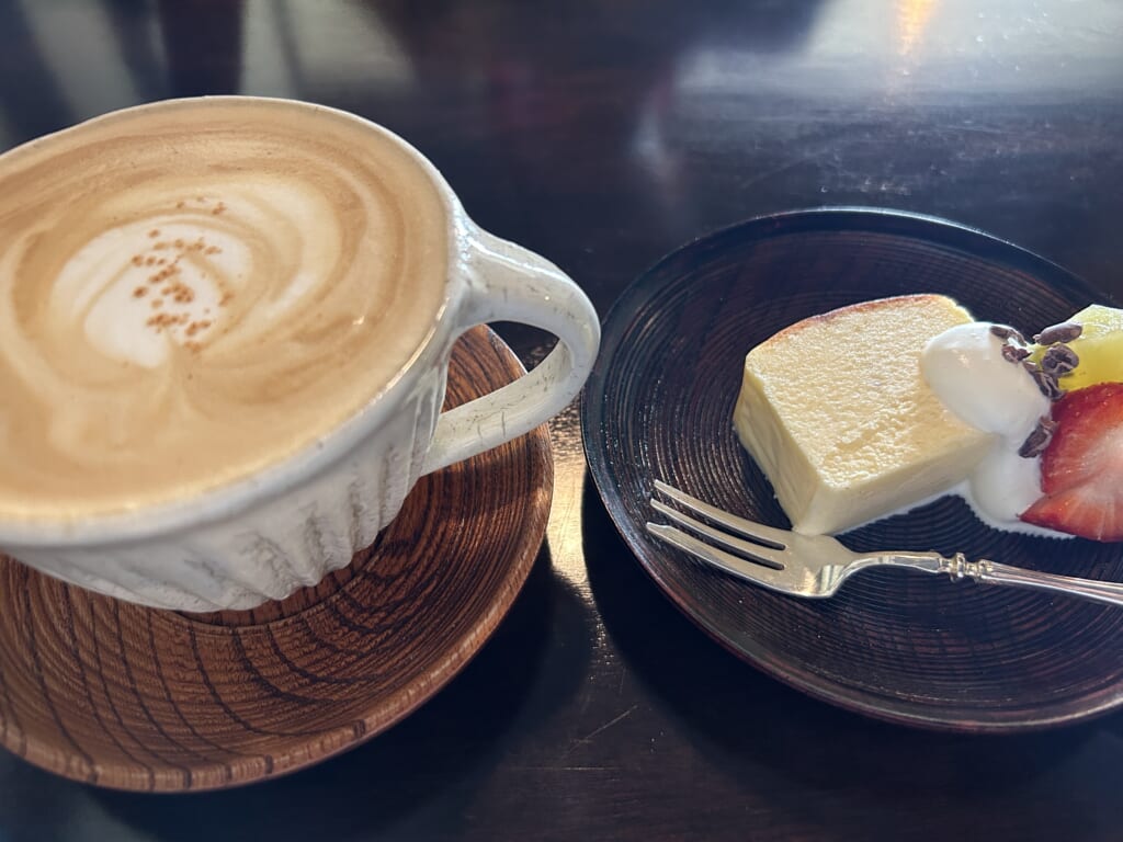 並々注がれたカフェラテ。手作業でミルクを泡立ててくれていました。その泡立てる音が心地よく空間のスパイスになっています。ぼてっとした厚さの質感で手に馴染む素敵な器での提供でした。
