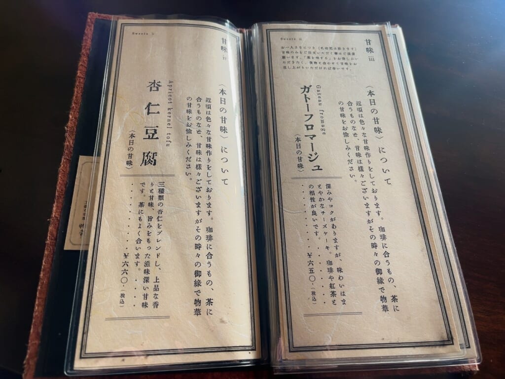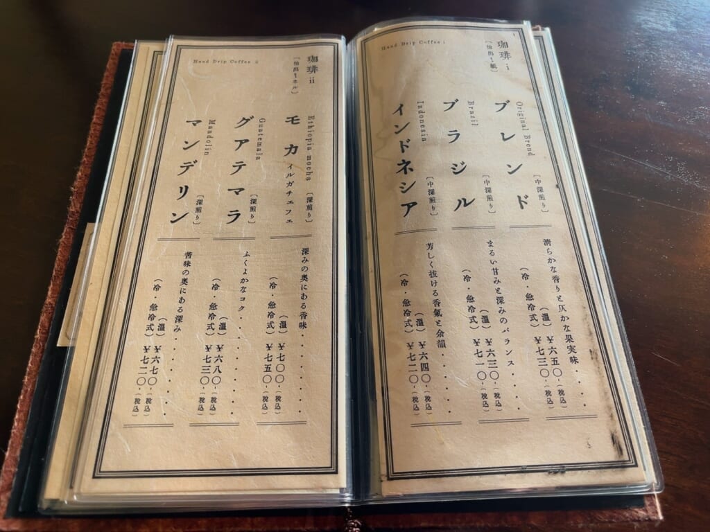 飲み物のメニューが豊富で、珈琲だけで6種類。