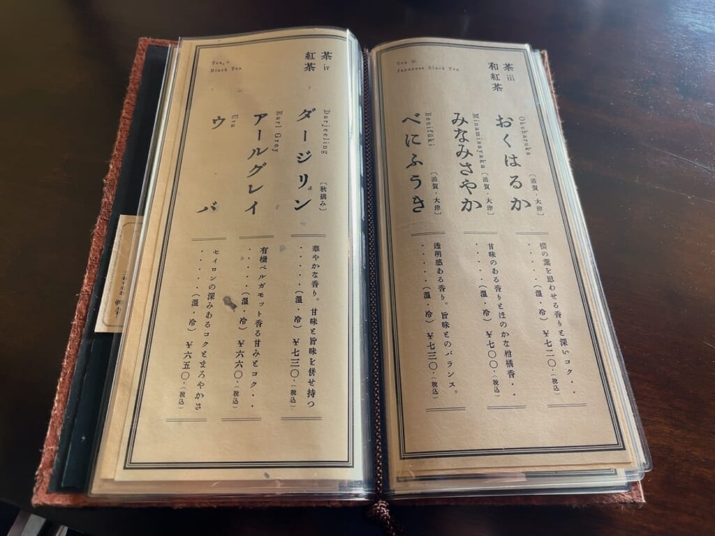 茶と紅茶で12種類もあります。お茶の説明を読んでいるだけで楽しいですね。この他にカフェラテやジュースもあり、豊富な品数に何を飲もうか悩みます。