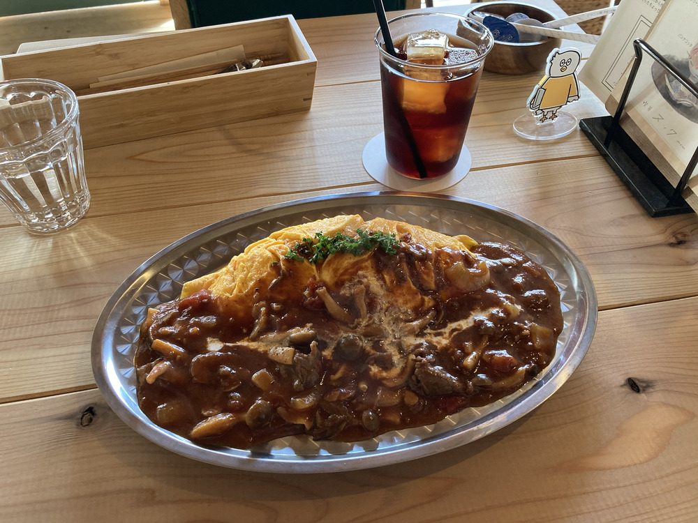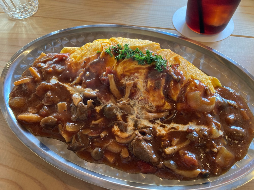 大きなオムライスに、たっぷりのソースがかかったボリュームのある一皿です。