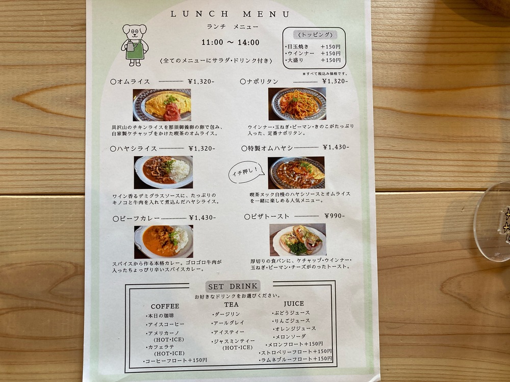 ランチメニューはすべてにサラダとドリンクが付くようです。