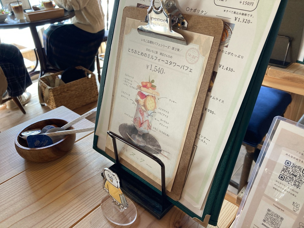 私が訪れたときには、期間限定、時間限定(14時~)でとちおとめのパフェもありましたよ。