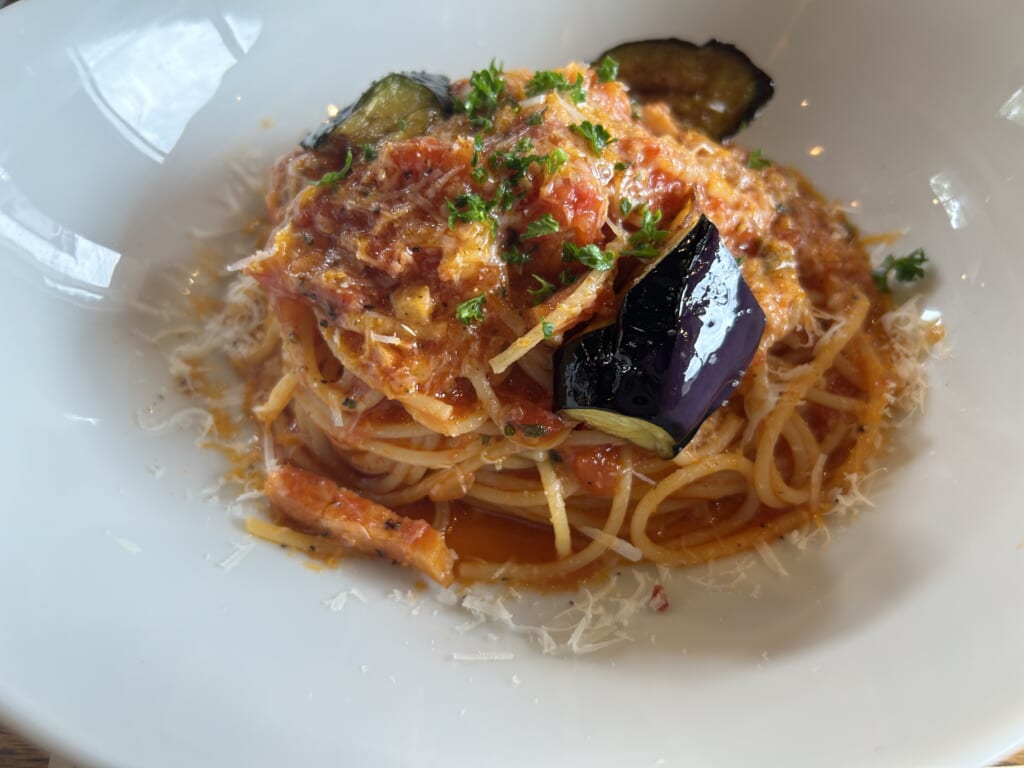 そして、日替わりパスタ(ベーコンとナスのアマトリチャーナ)1,200円。細めのパスタにさっぱりトマトソースがよく絡んでいて、ナスの素揚げが良いアクセント。