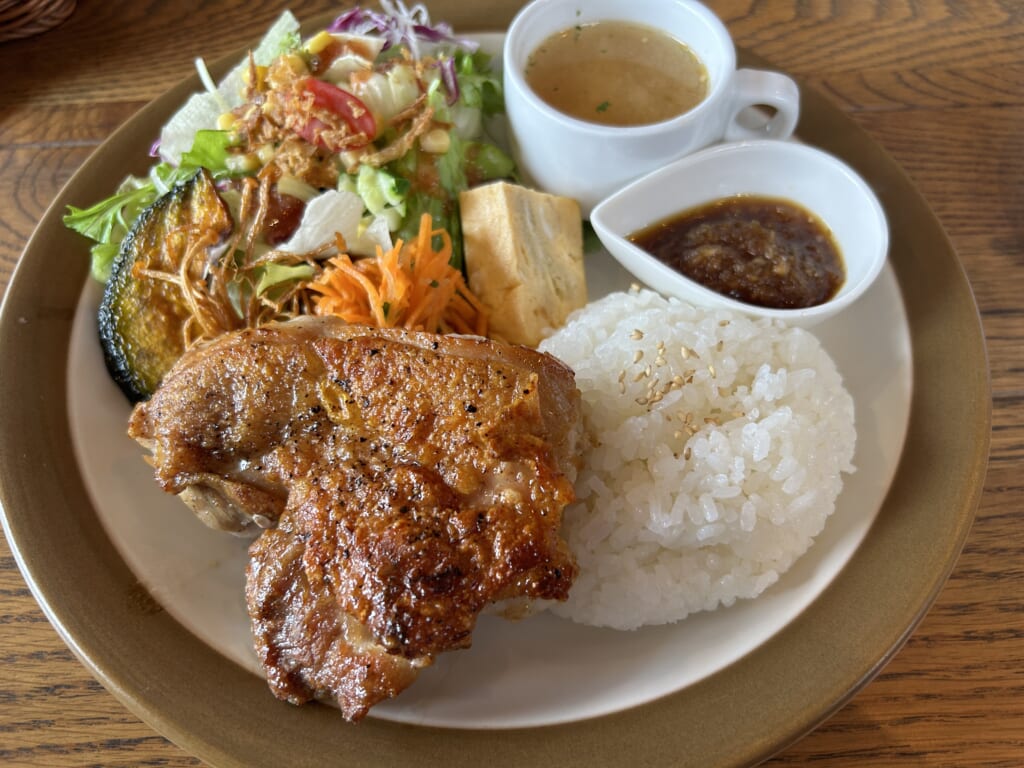 まずは、これ日替わりランチ 1,200円。皮がパリパリでお肉は肉厚ジューシー。付け合わせのサラダ・オムレツ・キャロットラぺ・素揚げのかぼちゃとえのき・スープそれぞれがワンプレートランチに彩りと満足感を与えてくれました♪