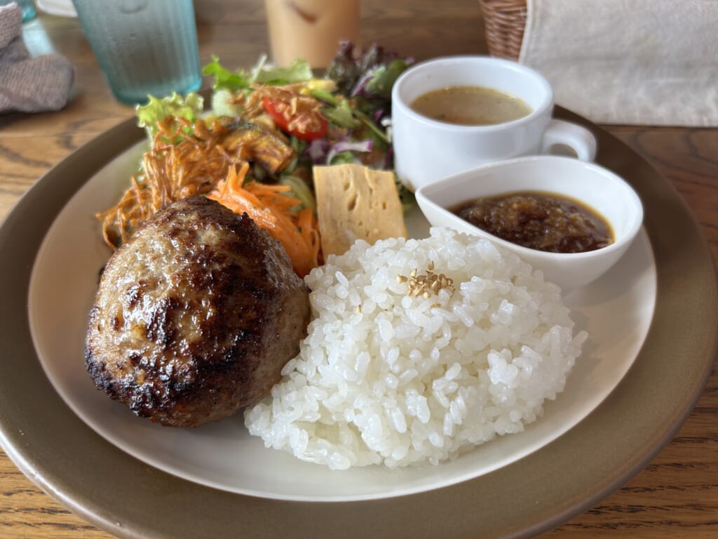 自家製ハンバーク 1,200円。ソースは2種類から選べます。こちらは和風ステーキソース。肉汁じゅわっと、お肉ふわふわ。ペロリと食べられるKONOKA人気の一品です。