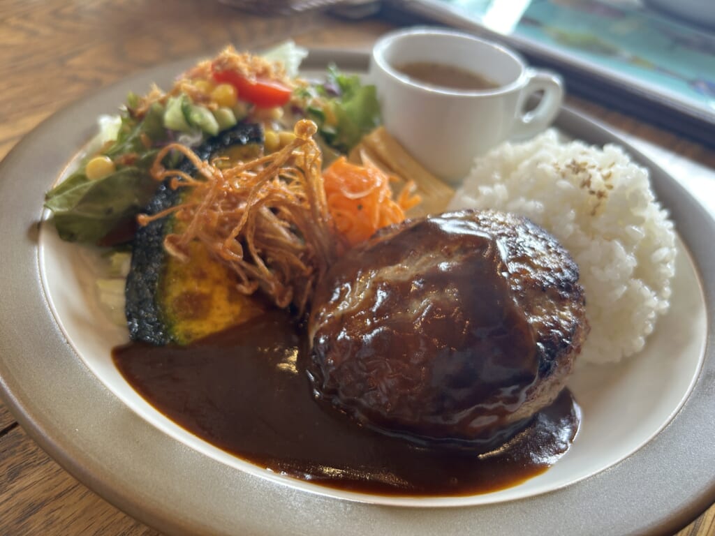 こちらも同じく自家製ハンバーグですがデミグラスソースVer。小ぶりかと思ったハンバーグも牛肉と肉汁がたっぷり、ぎっしりと詰まって食べ応え◎なハンバーグです!ナイフで切ろうとした瞬間にあふれ出る肉汁が食欲爆発させてくれました。デミグラスソースは濃すぎず、お肉の風味を消さない抜群のバランスです。