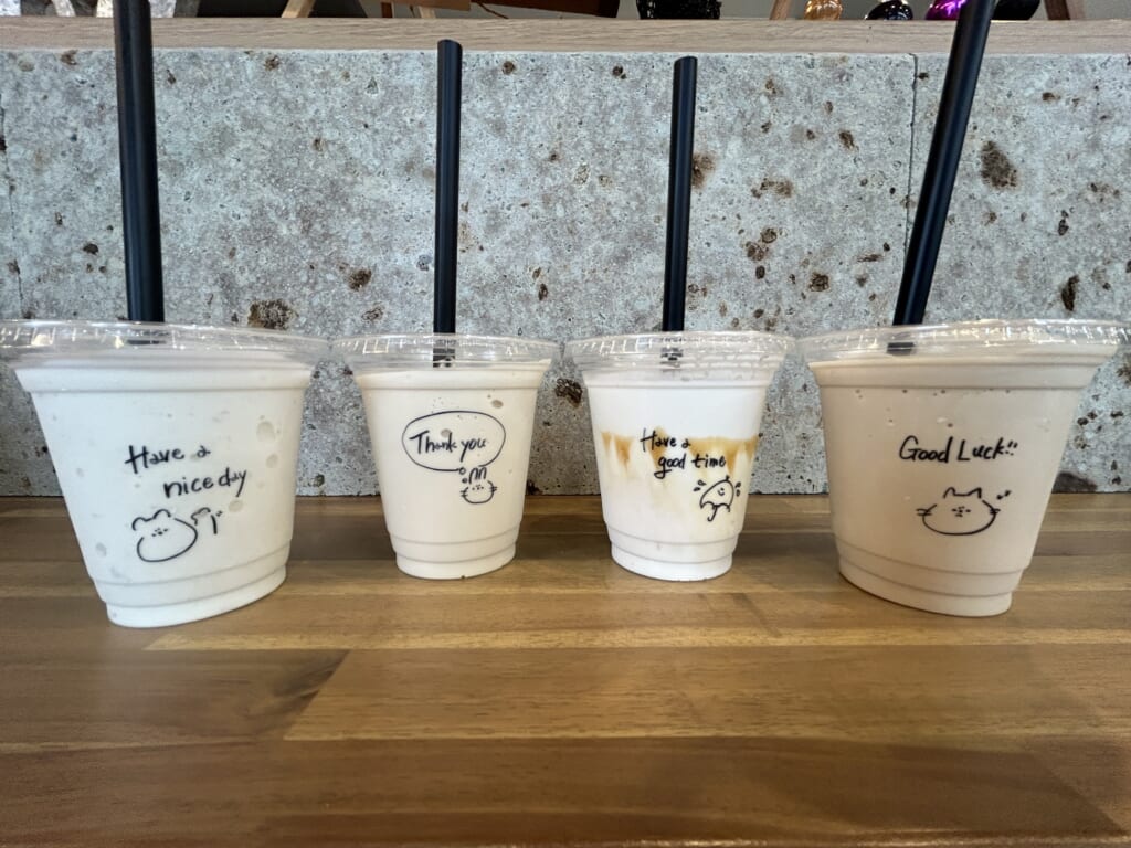 左から、バナナシェイク(550円)、ミルクティーシェイク、キャラメルシェイク、カフェオレシェイク(各600円)です。それぞれのカップに書かれているメッセージを変えてくれる心使い♪もちろん、どれも美味しいです!