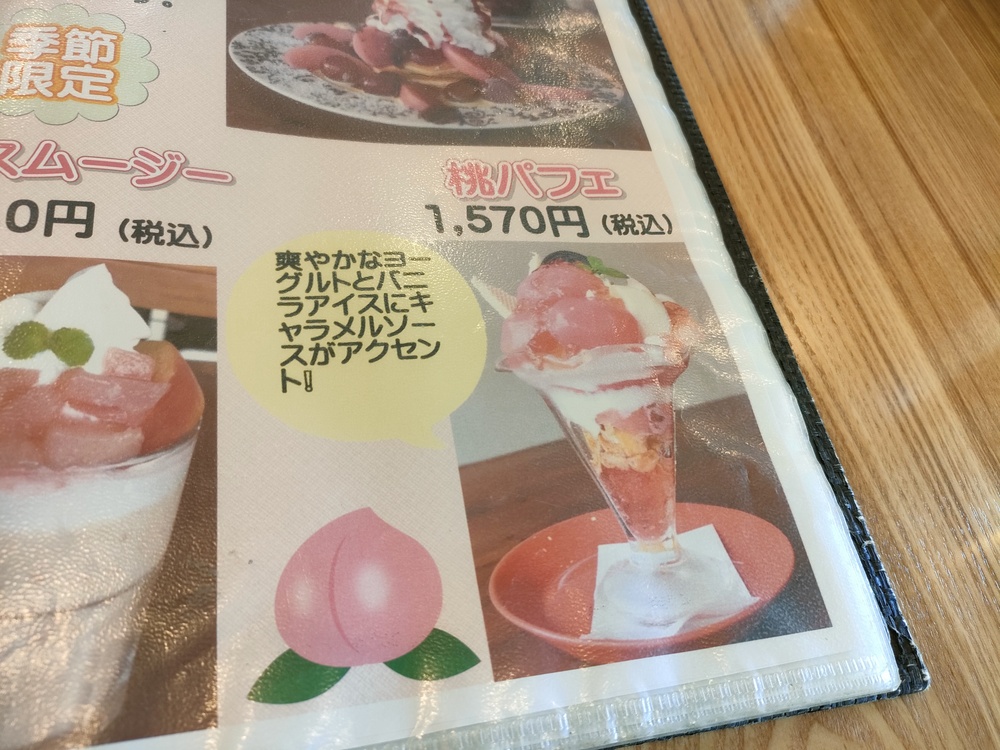 私は入口に飾ってあった写真を見て、桃パフェが食べたいなと思っていたので、迷うことなく注文しました。