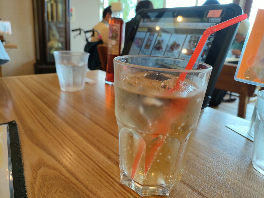 パフェの前に頼んだジンジャーエールが席に届きました。たっぷりグラスに注がれていました。最初のひとくちが特においしく、外の気温も相まって一気に飲み干してしまいました。