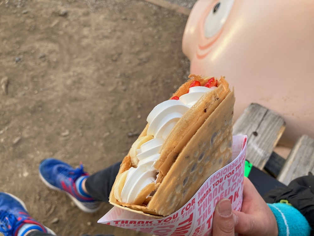 受け取った時に手に収まる感覚が、今まで食べていたクレープとは違うことに少し戸惑ってしまいましたが、漂う甘い香りはクレープなのが不思議な気分でした。