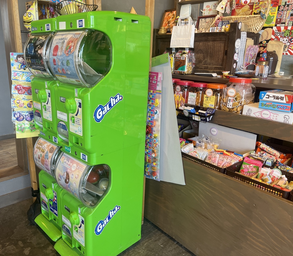 駄菓子の他にガチャガチャもあり、シェアスペースというだけあって飲食スペースも広々しています。夕方になると小さいお子さんから学生さんでにぎわい、おもわず「ただいま~!」と言いたくなるような空間です。