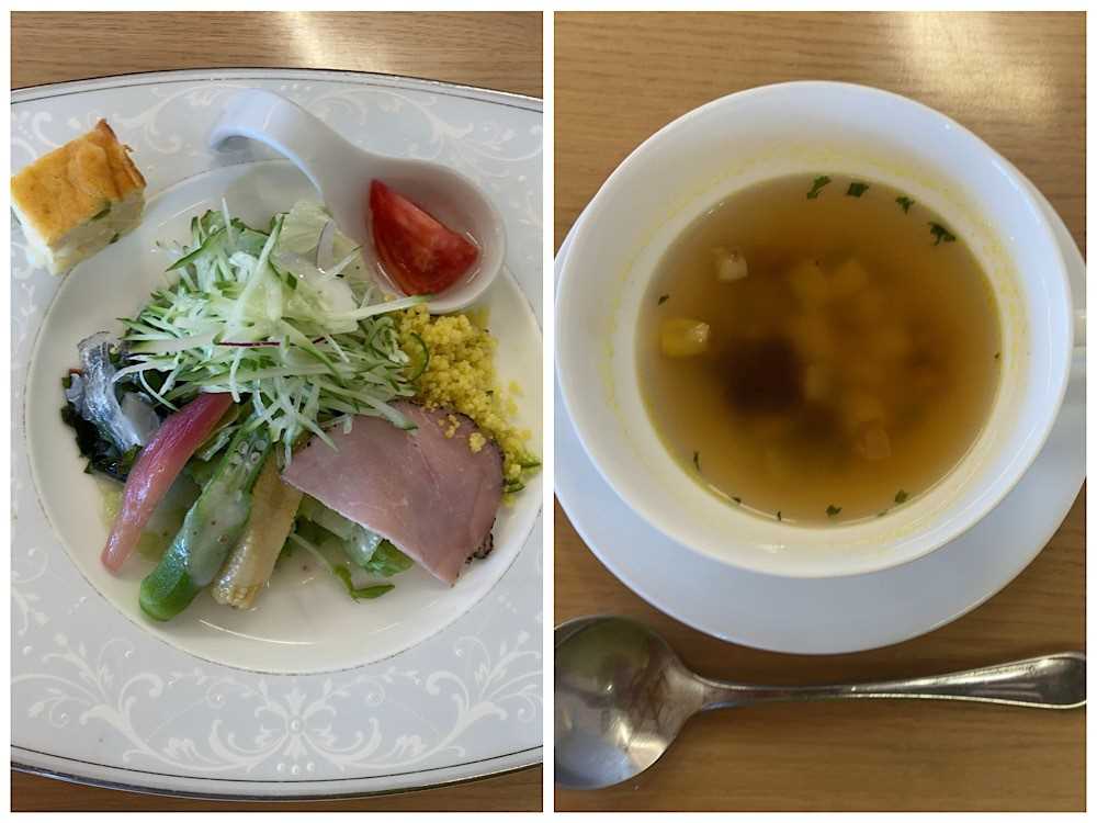最初に運ばれてきたサラダは、オクラやトマトなど種類豊富な野菜や海藻がたっぷり!