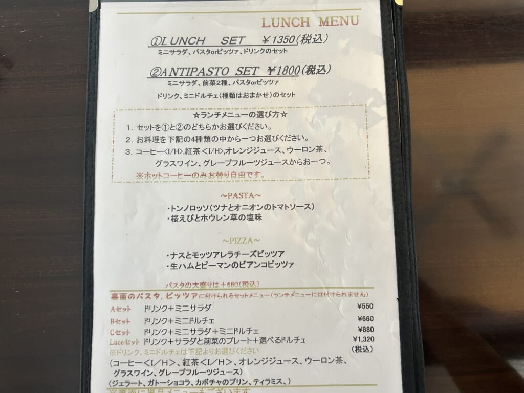 ランチメニューのパスタとピッツァはそれぞれ2種類から選べます。