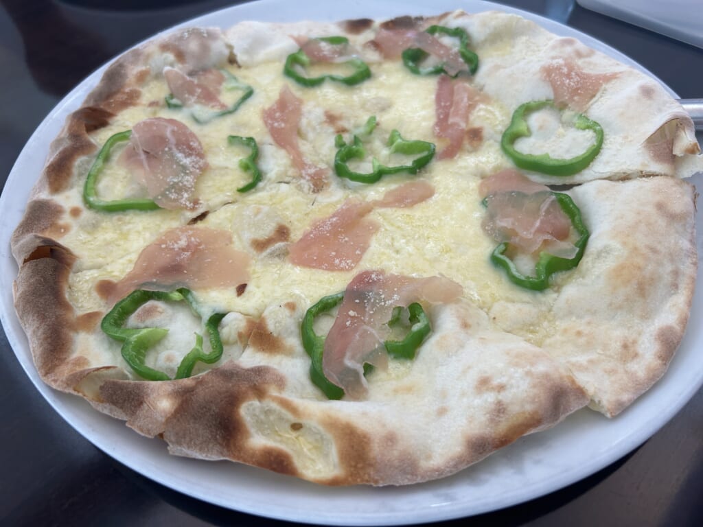 我が家の娘たちは、とにかくピッツァが大好き。まずは、ランチメニューの生ハムとピーマンのビアンコピッツァを1,800円のセットで。