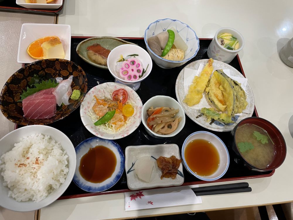 新鮮でおいしいお刺身の小鉢。サクサクの天ぷら、お漬物、煮物、煮魚(小)、茶わん蒸し、きんぴら、季節のフルーツなどです。