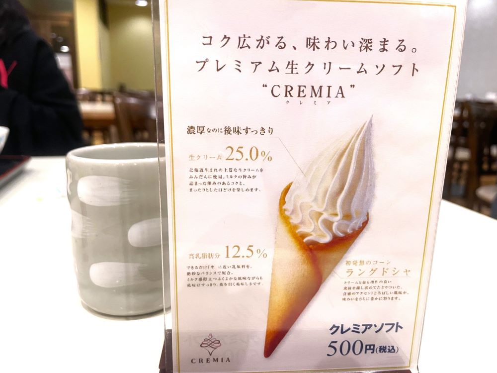 このクレミアソフトはよく見かけるコーンではなく、「ラングドシャ」にのせていただきます。とにかく濃厚に、そしてたべやすいコクにこだわったソフトクリーム。たべてみたくなりますね!
