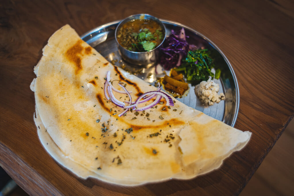 ちなみに、注文はしていないのですが、こちらがドーサ。隣の席の方が注文していたので、撮影させていただきました。米と豆を発酵させた生地で作るクレープのような料理とのことで、今度食べてみようと思います。