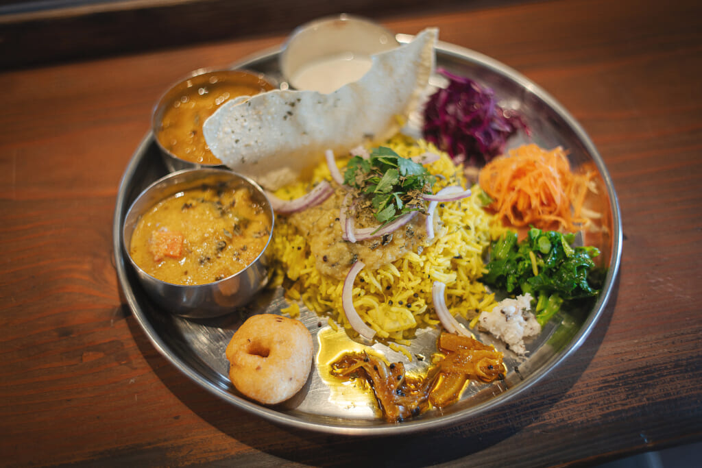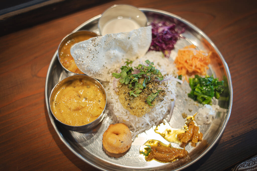 こちらがベースの南インドミールス。本格的はビーガン料理は初めて!どのお料理も初めて食べるものだったので、1品づつ説明をいただきました。