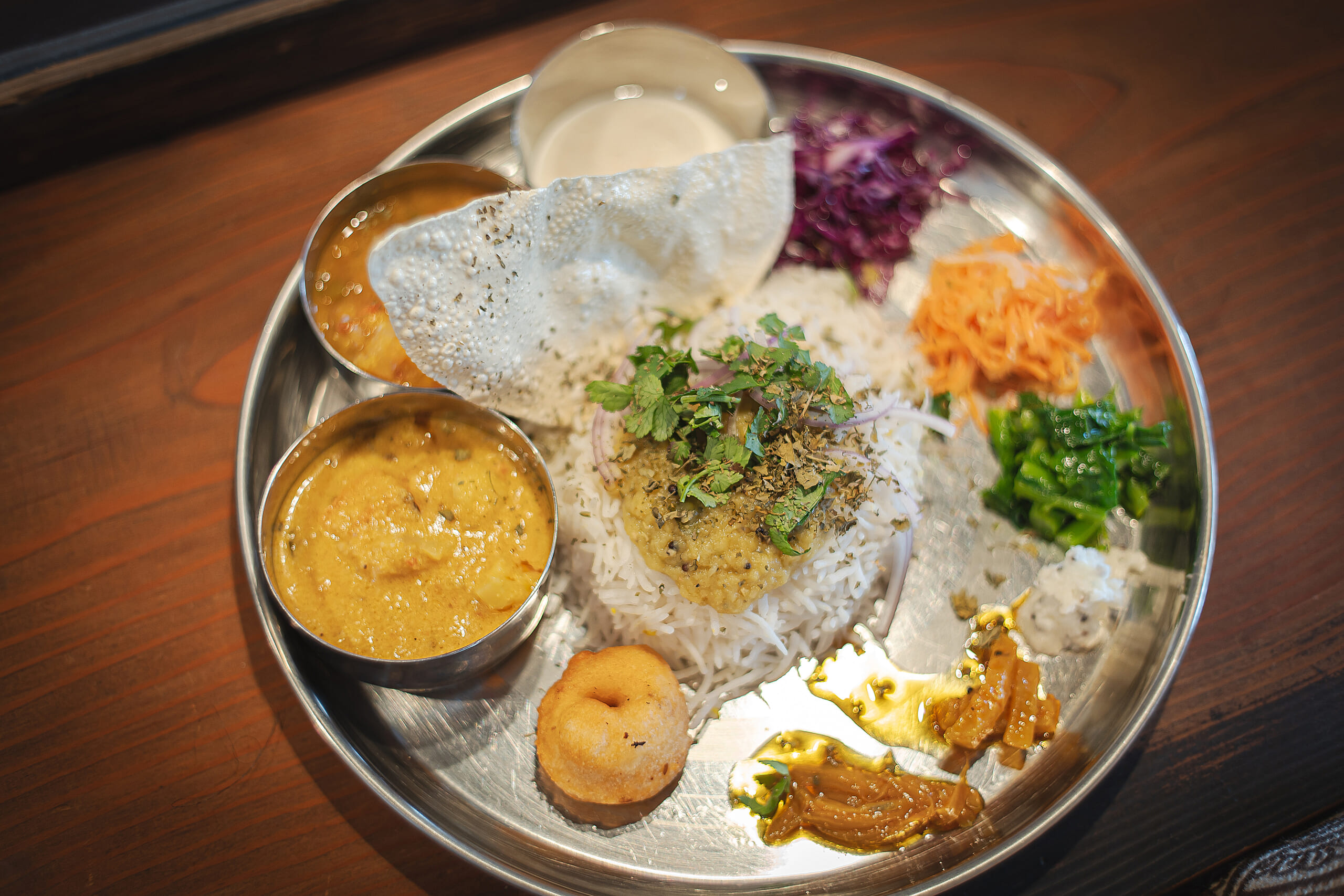 この日のメニューは、南インドミールス(ビーガンミールスワンプレートスパイスカレー)とIndiaドーサ。