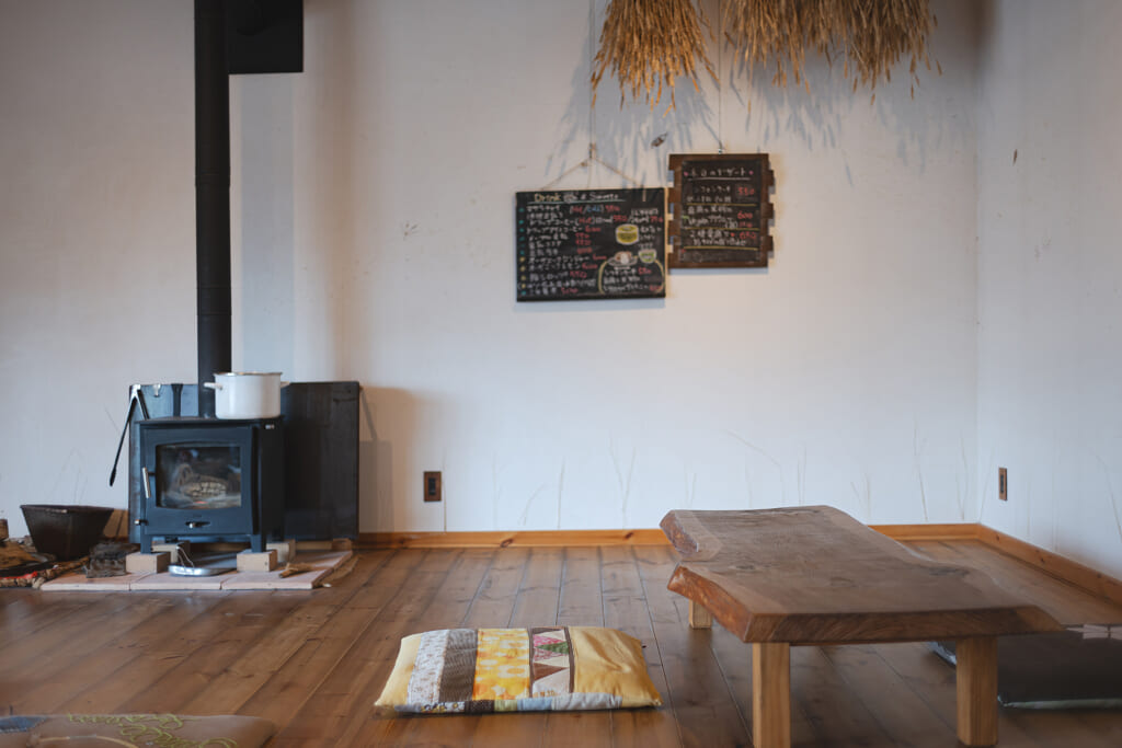 ガラス戸で仕切られた飲食スペースには、1枚板の4人掛けほどのテーブル3つ、6人掛けほどのテーブルが1つあります。手作りの座布団カバーがとっても可愛いく、どの座布団に座ろうかと悩んでしまいました。
