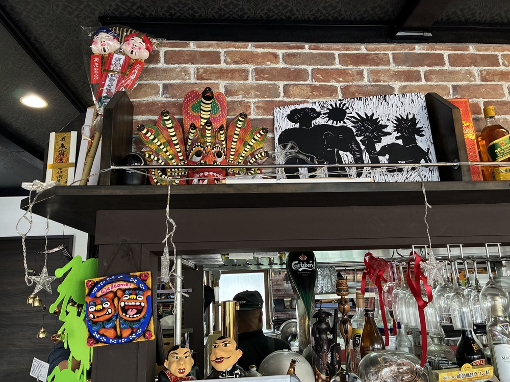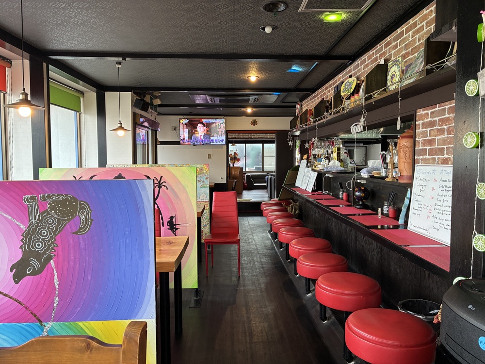 お店の中を見渡すと鮮やかな赤い椅子が並び、パーテーションにはカラフルな絵がたくさん描かれています。ゾウの絵とスリランカのお面の隣には日本の熊手があり、楽しくて思わず子どものようにキョロキョロと見渡していました。