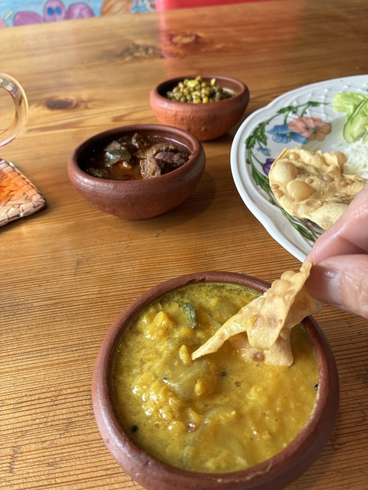 ダール豆カレーをパパドにつけて食べてみました。パリパリのパパドにもカレーが合い、ご飯とはまた違うおいしさでした。