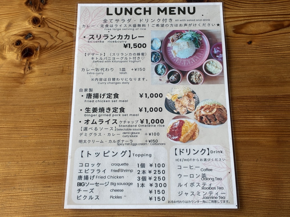 ランチメニューにはカレーの他に、唐揚げ定食・生姜焼き定食・オムライスが各1,000円であります。食べられる選択肢が多いので、好みが違う友達・家族など大人数で来店してもいいですね。