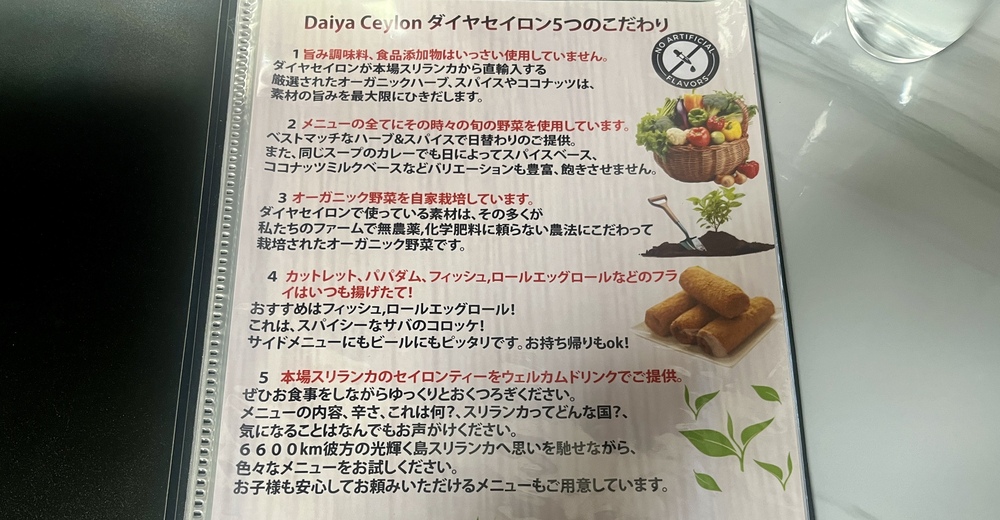 メニューの1ページ目にはDAIYA CEYLONのこだわりが書いてありました。