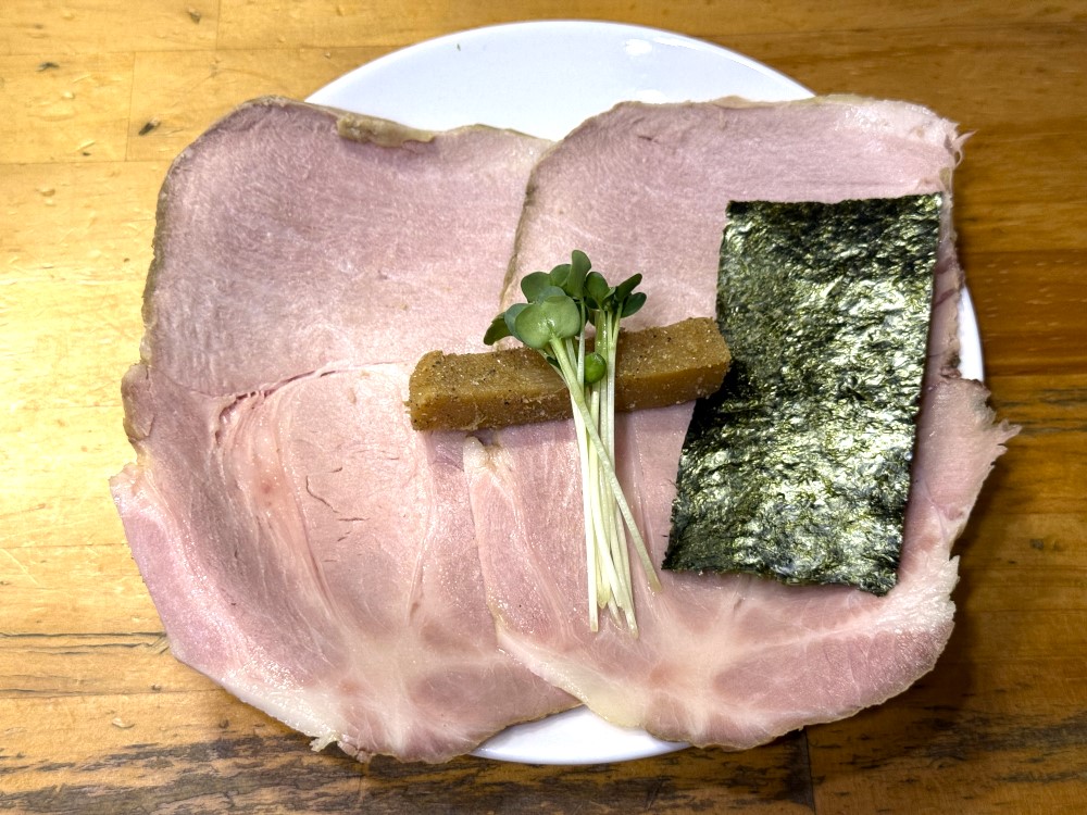 「ちゃーしゅー」は超大判。低温で調理されていて、なめらかな口当たりの至高の一品です。噛むほどに広がるジューシーな肉汁はクセがなくおいしい。