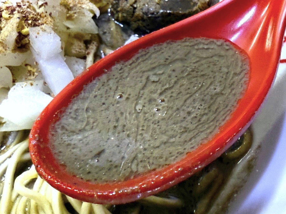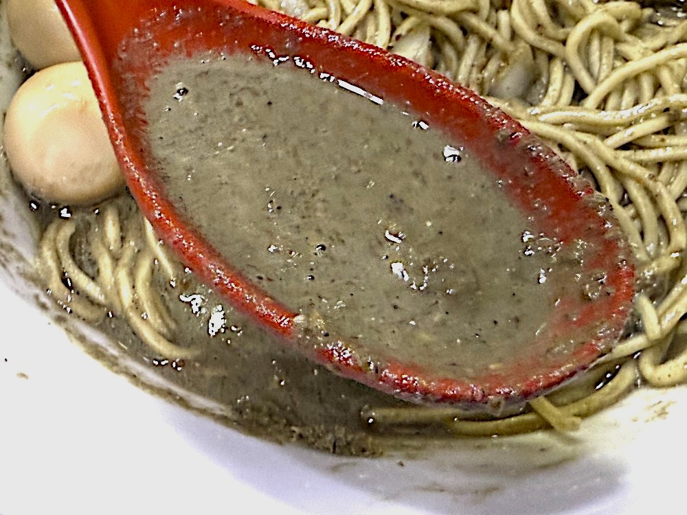 他とは明らかに違う黒さの「にぼブー」は、香味油によって豊かな香りが際立ち、コクも旨みも濃厚。まさしくマニアの領域と言えるほどの強い煮干し感があります。