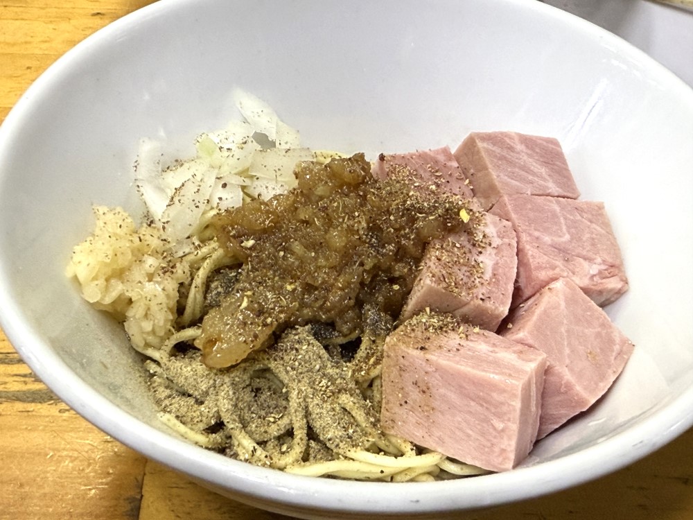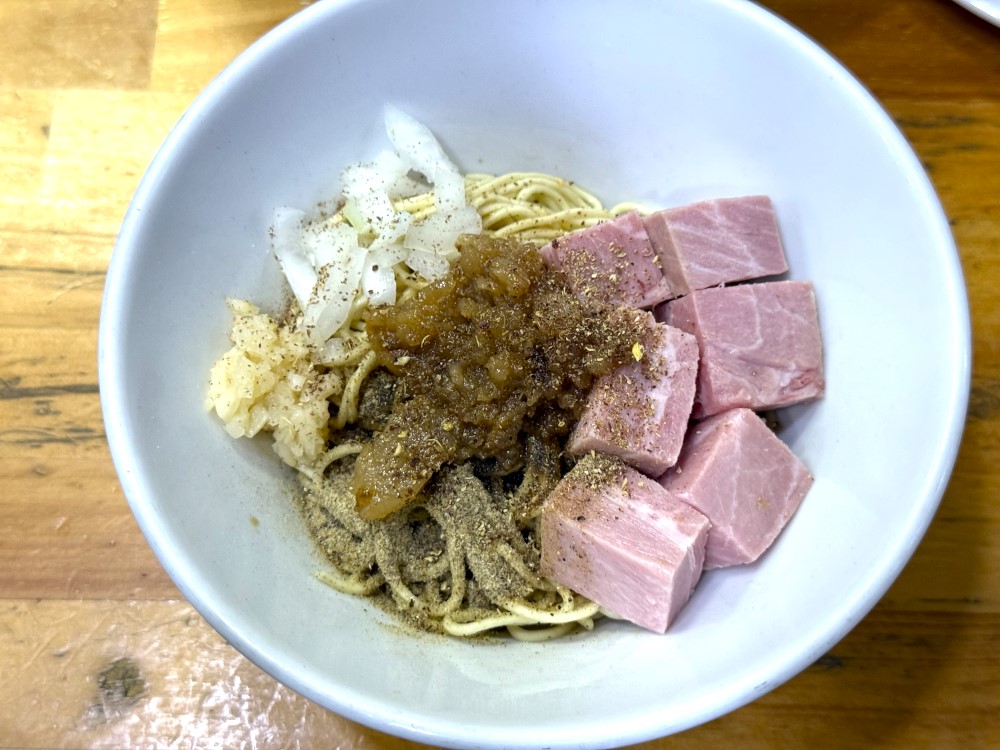細麺に刻み玉ねぎ、サイコロちゃーしゅー、味付き背脂がトッピングされたもの。